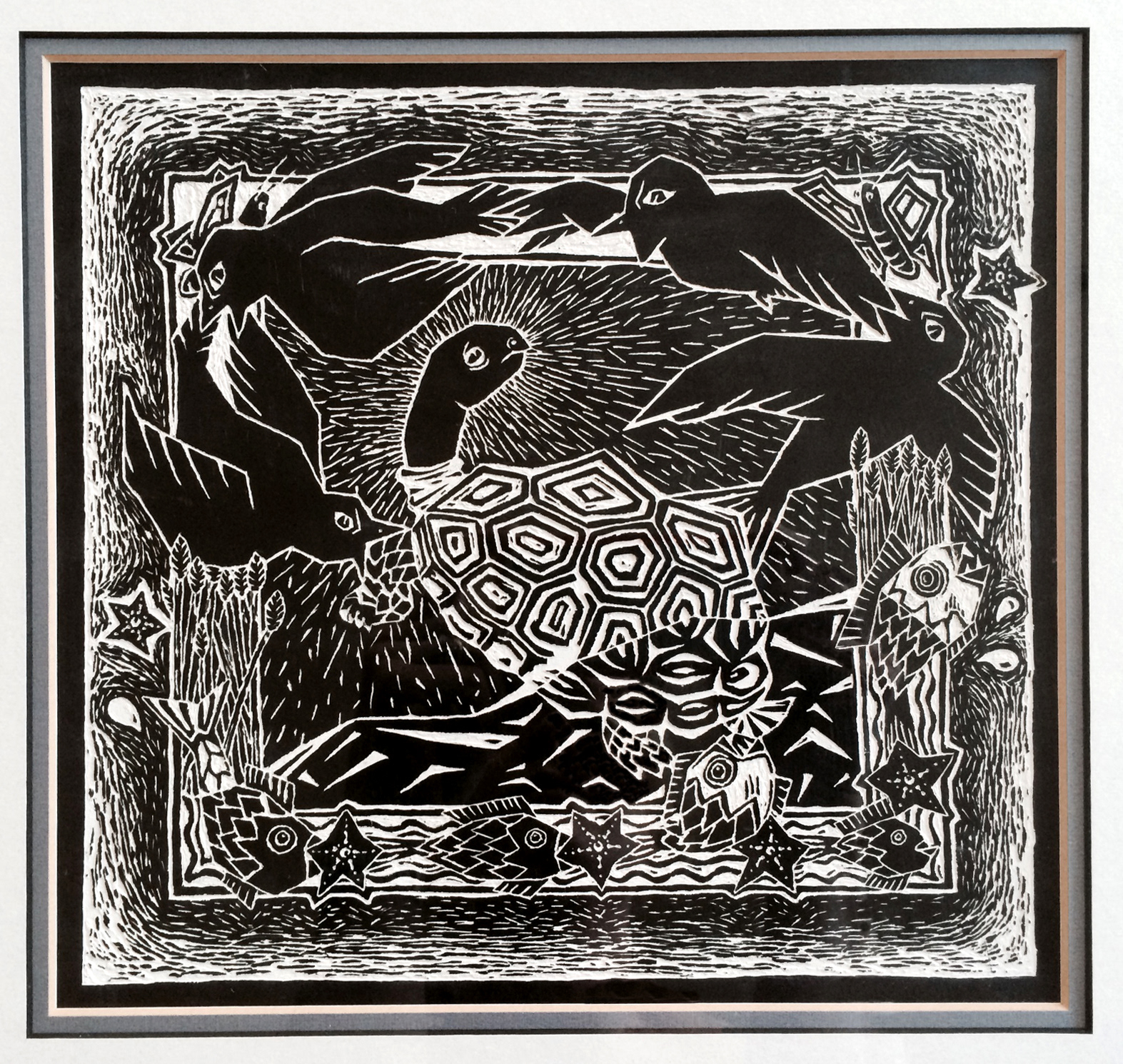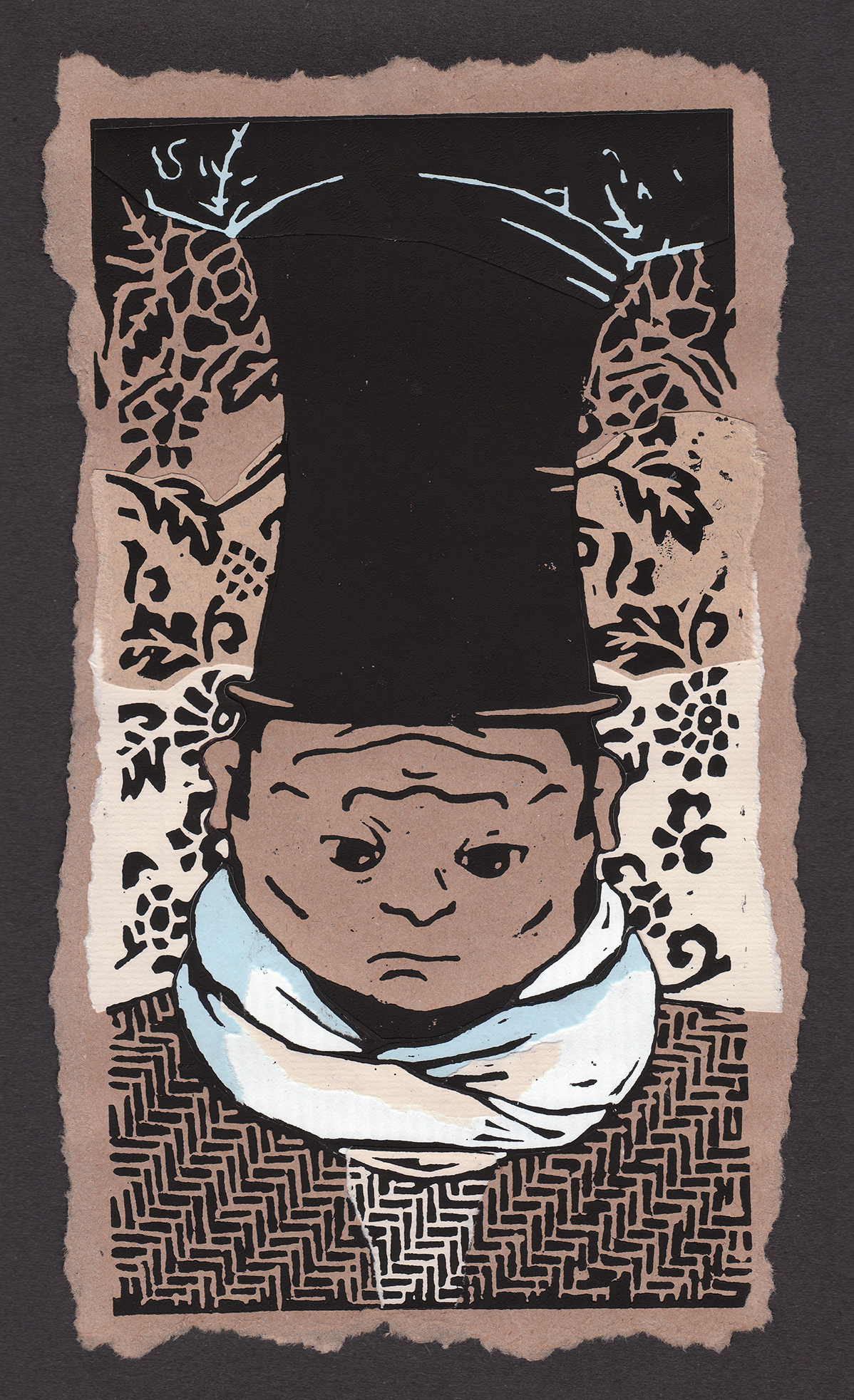 Image two. (Image one upside down) I played with printing the linocut on different papers and collaging it.